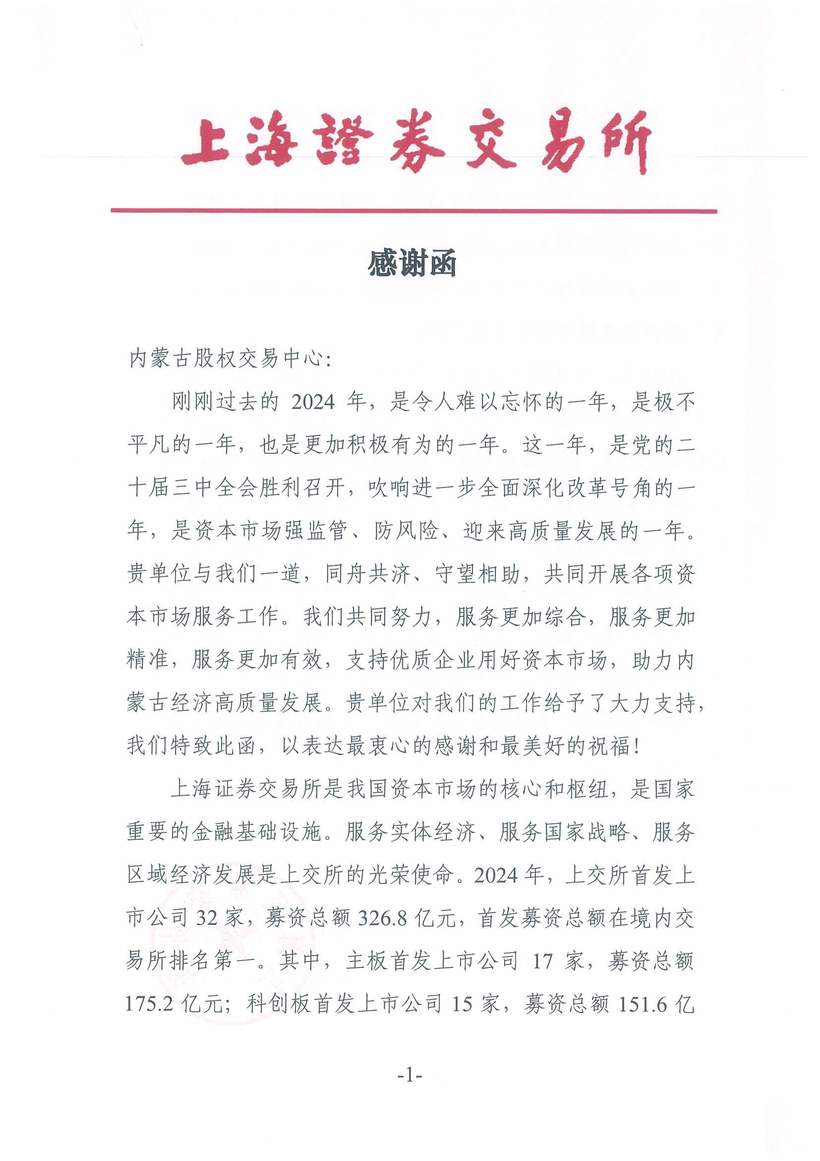 內蒙古股權交易中心喜獲上海證券交易所感謝信