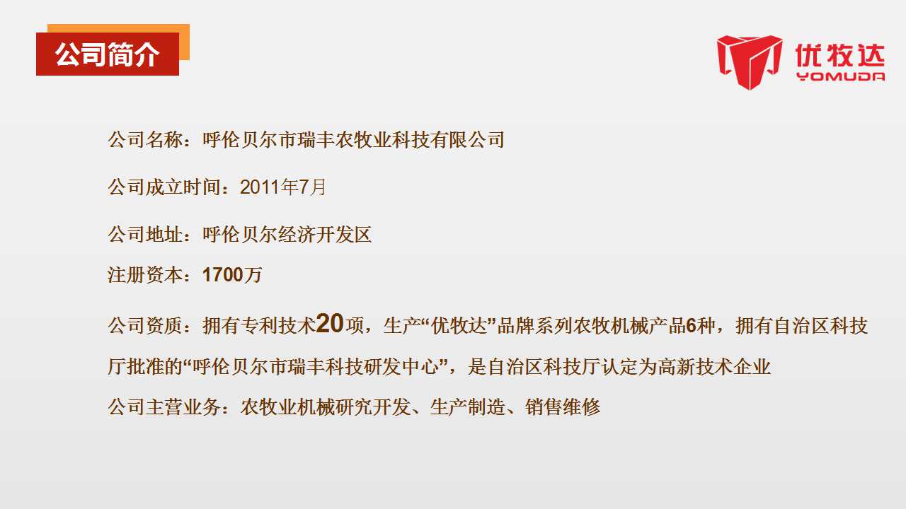 ·公司擁有專利技術20項,“呼倫貝爾市瑞豐科技研發中心”已通過自治區科技廳批準認定“優牧達”系列牧草機械榮獲2016年全國“精耕杯”——“用戶最心儀的飼料收獲機械十佳品牌”,具有技術領先、結構堅固、工作效率高等特點,品牌其技術水平在呼倫貝爾地區同行業處于先進水平。