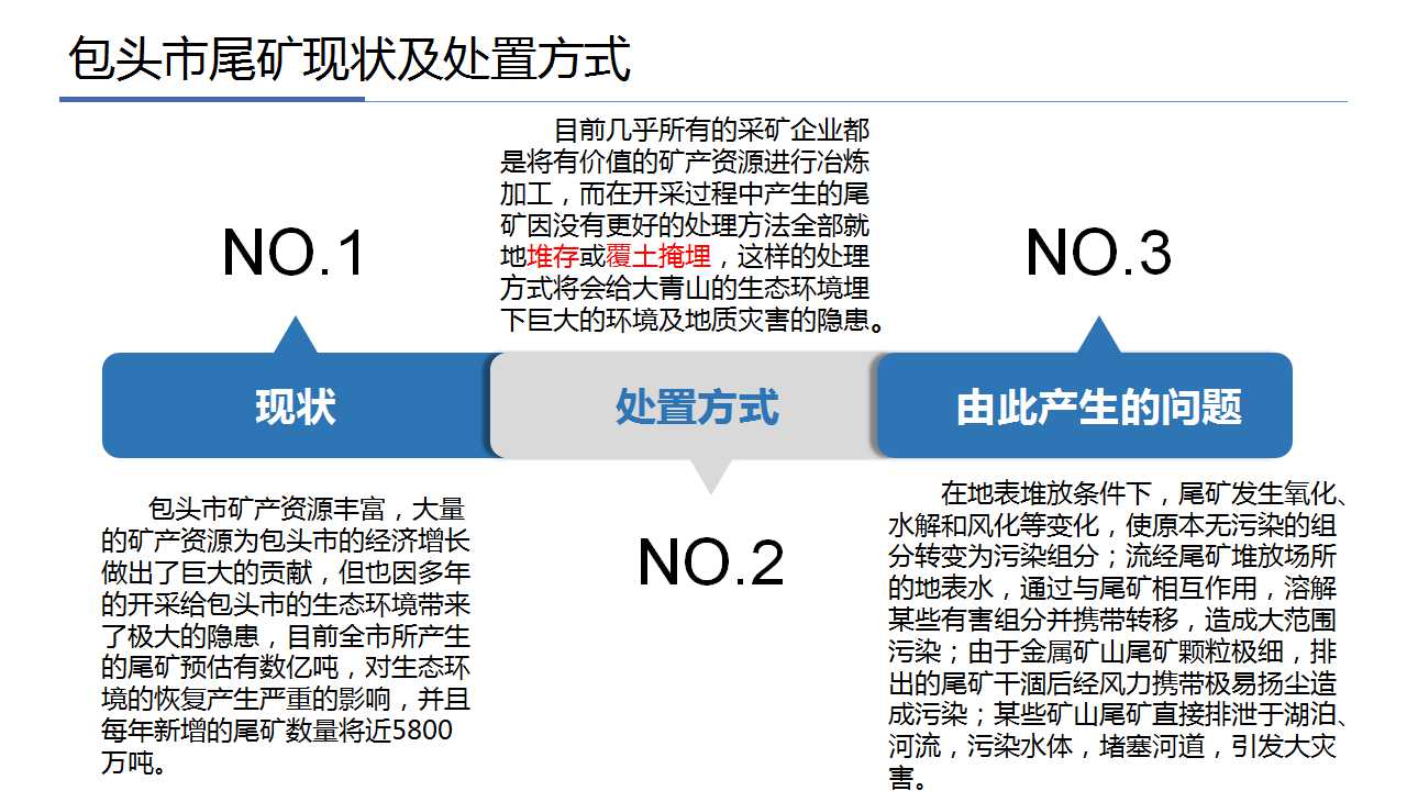 該項目致力于消納包頭市多年來所產生的數億噸廢棄尾礦,以尾礦石作為原材料進行建筑材料的生產加工,主要產品為機制砂,同時,在生產過程中產生附屬產品石粉。