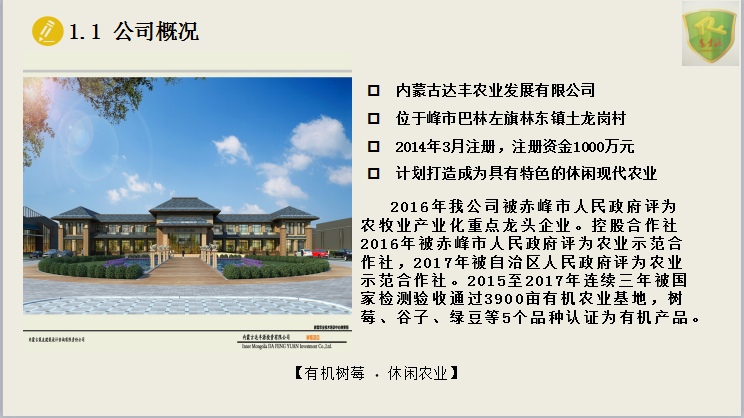 ·擁有國家檢測的有機農業基地3900畝,國家認證的樹莓、谷子、綠豆等5個有機產品品種。