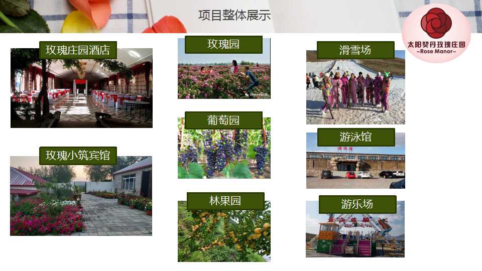 ·莊園包含玫瑰園、葡萄園、林果園、玫瑰莊園酒店、玫瑰小筑賓館、游泳館、垂釣園、游樂場、滑草/滑雪場、苗木基地等,建成區占地面積780畝,建筑面積1200平方米,已完成總投資2800萬元