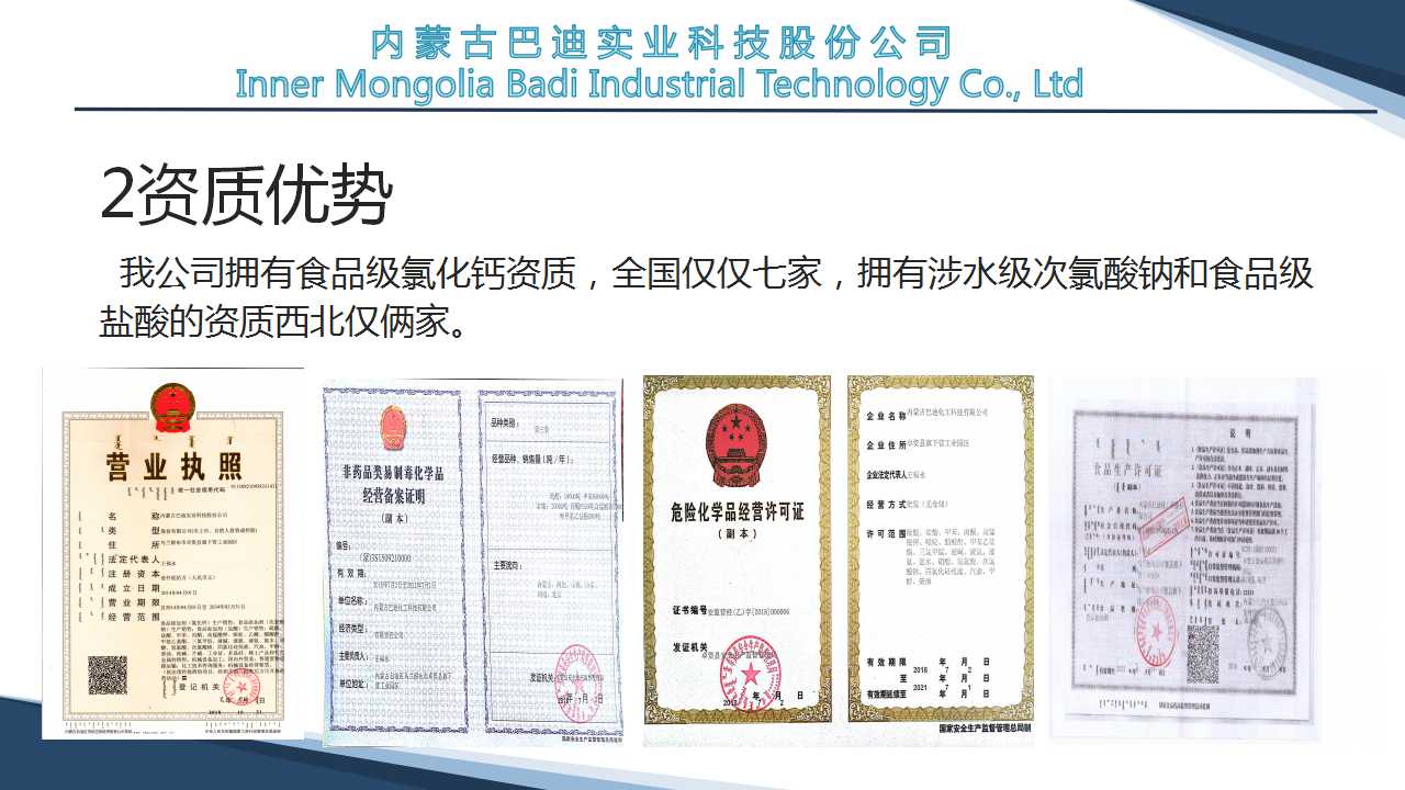*公司具有食品級氯化鈣、涉水級次氯酸鈉、食品級鹽酸生產經營資質及兩項循環經濟產業鏈,真正實現了企業廢棄物循環再利用。