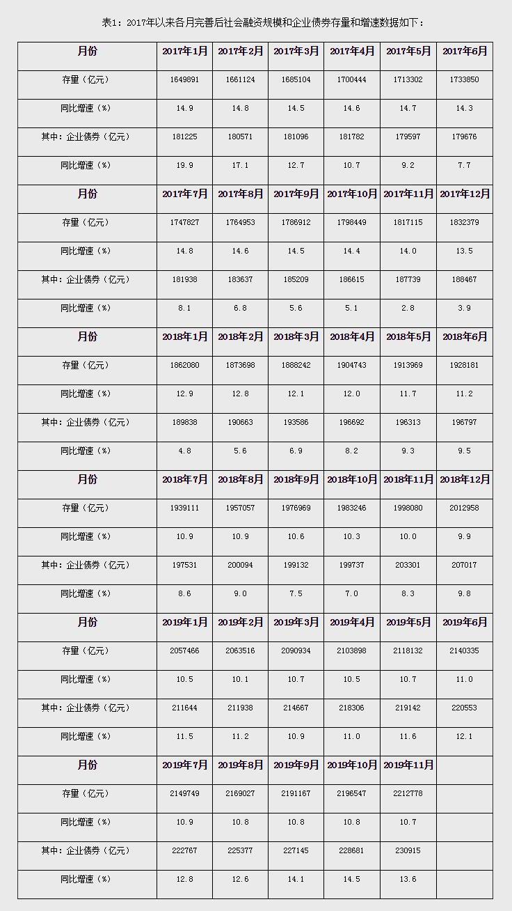 注2:2019年9月起,人民銀行進一步完善“社會融資規模”中的“企業債券”統計,將“交易所企業資產支持證券”納入“企業債券”指標,2017年以來可比口徑數據見表1。