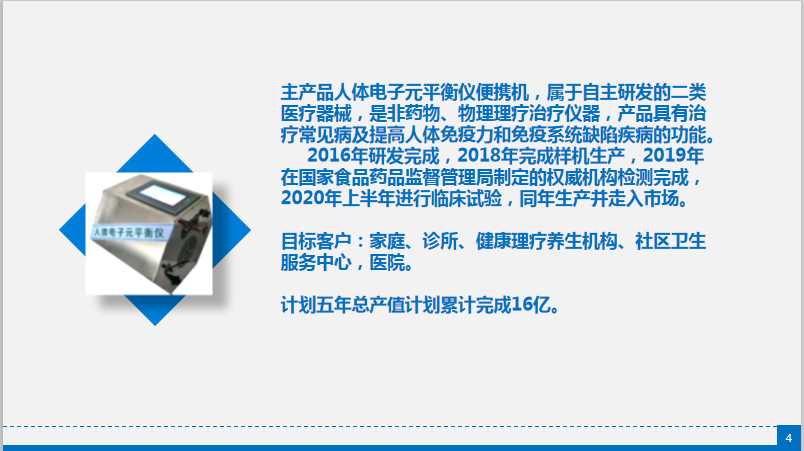 該項目的產品是人體電子元平衡儀便攜機,屬于自主研發的二類醫療器械,是非藥物、物理理療治療儀器,產品具有治療常見病及提高人體免疫力和修復免疫系統缺陷的功能。2016年研發完成,2018年完成樣機生產,2019年在國家食品藥品監督管理局制定的權威機構檢測完成,2020年上半年進行臨床試驗,同年生產并走入市場。