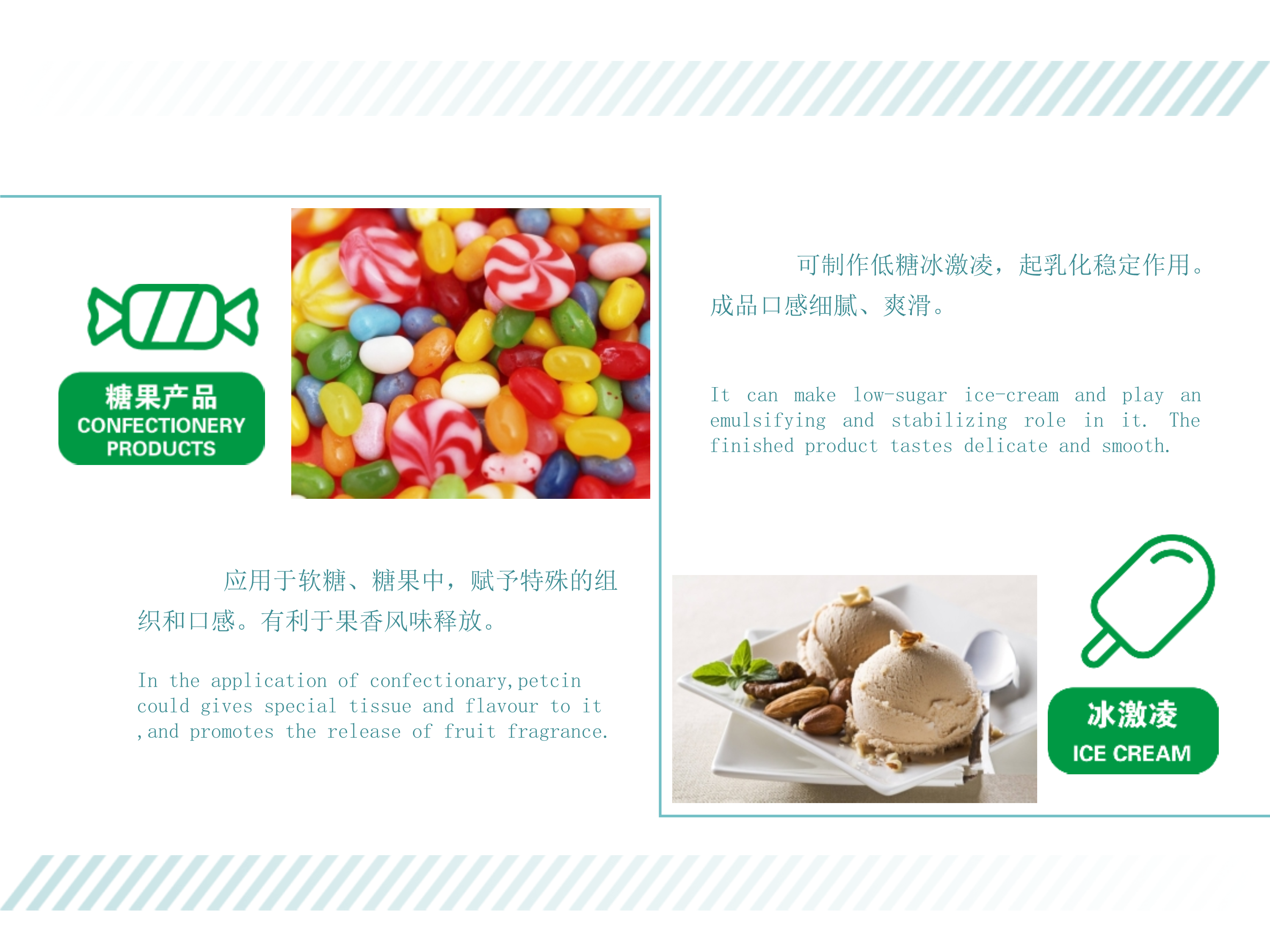 6、果膠更多是食品工業領域的應用。要抓住現階段消費品升級和消費量增加的市場機遇快速發展。果膠在飲料行業應用較多,可以和大型飲料公司展開合作,尤其是低脂飲料的早期技術研發中就介入最好,飲料市場空間較大。