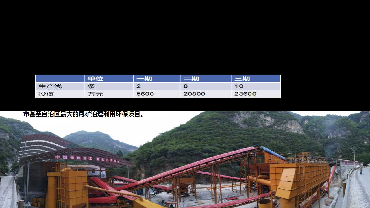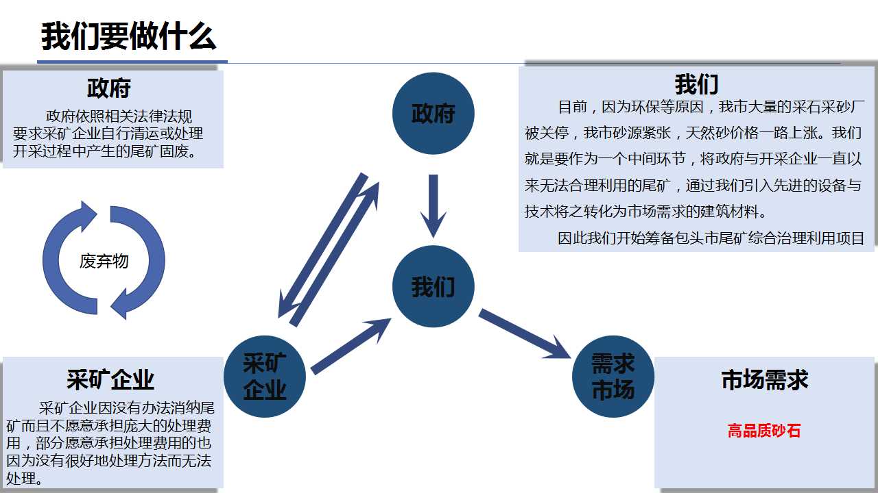 該項目致力于消納包頭市多年來所產生的數億噸廢棄尾礦,以尾礦石作為原材料進行建筑材料的生產加工,主要產品為機制砂,同時,在生產過程中產生附屬產品石粉。