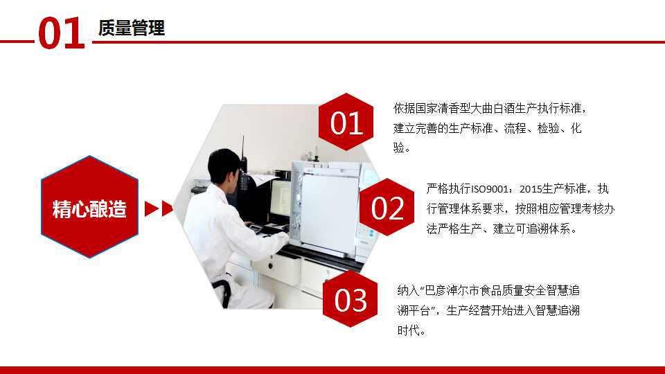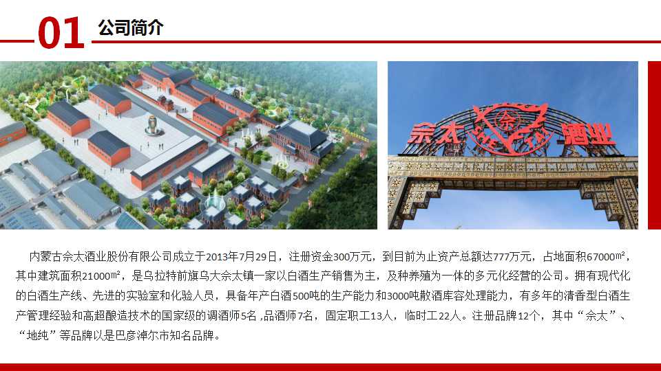 公司是烏拉特前旗烏大佘太鎮一家以白酒生產銷售為主,集種養殖為一體的多元化經營的公司。擁有現代化的白酒生產線、先進的實驗室和化驗人員,具備年產白酒500噸的生產能力和3000噸散酒庫容處理能力。產品嚴格按照ISO9001:2015生產標準執行,并建立了可追溯體系,并在第二屆內蒙古食品安全年暨呼和浩特“國家食品安全城市”創建宣傳活動中,被組委會評選為食品安全示范單位。
