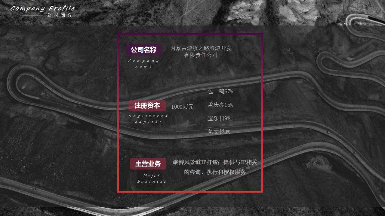 ·公司從游牧之路風景道IP的核心價值出發,向用戶輸出高品質的咨詢、執行和授權服務,改善風景道沿線旅游業的現狀,以實現內蒙古旅游風景道第一品牌的目標。