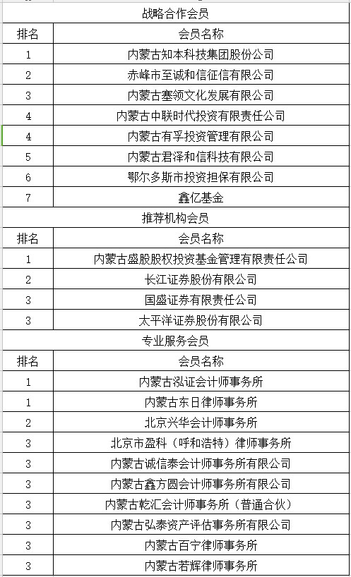 根據《內蒙古股權交易中心會員管理規則(試行)》和《內蒙古股權交易中心會員考評細則(試行)》等有關規定,對會員機構執業情況進行匯總,具體排名如下: